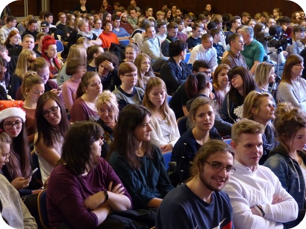 Uhr ging es los. Die Aula bis auf den letzten Platz gefüllt und